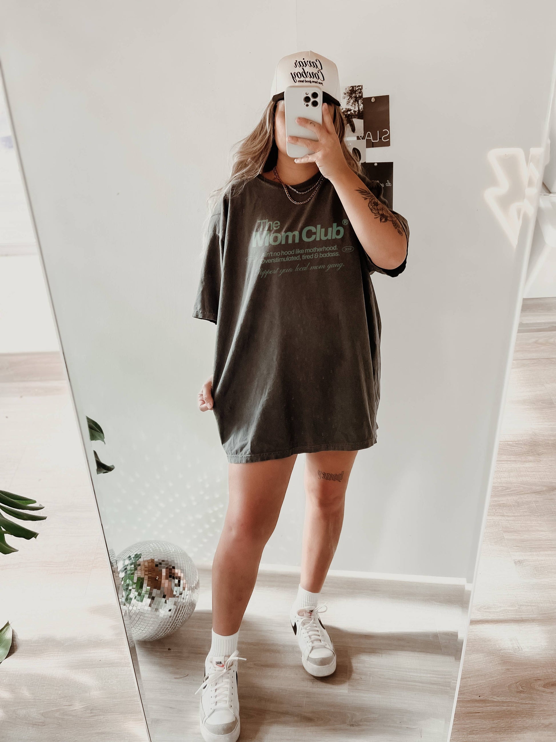 A LOLA MAGNOLIA ORIGINAL. ⚡️ Welcome to The Mom Club. ✌🏼 Ain't no hood like motherhood. Overstimulated, tired & badass. Support your local mom gang. 100% heavy cotton tee. Unisex. Printed on a comfort colors heavy cotton tee! Care Instructions: Machine wash cold, hang to dry! *Model has sized up for a oversized look*